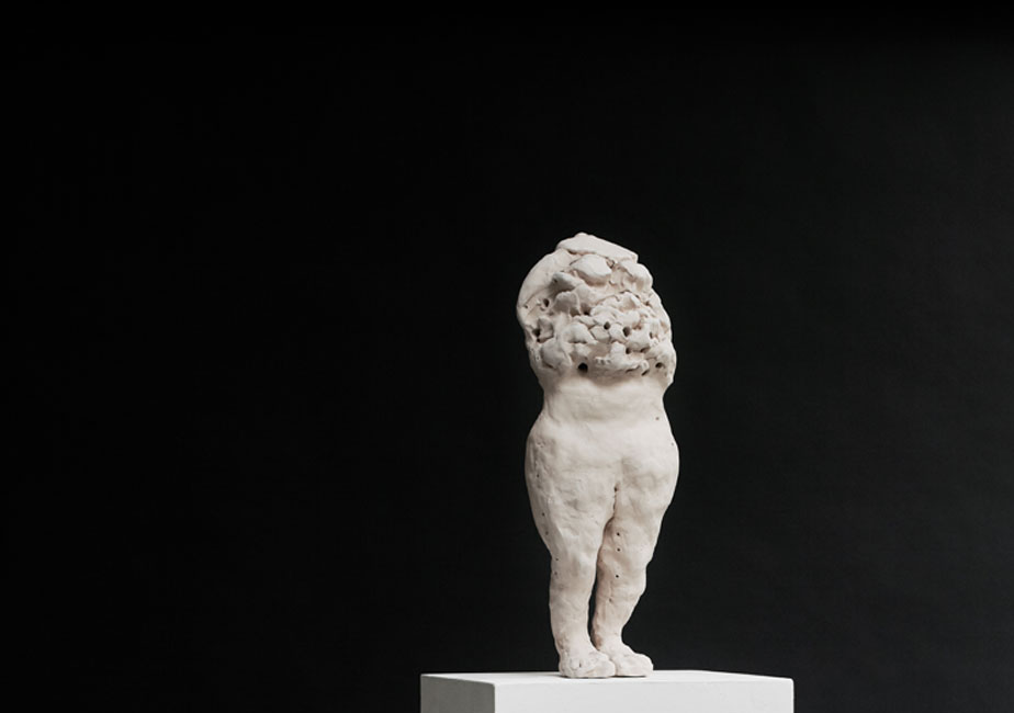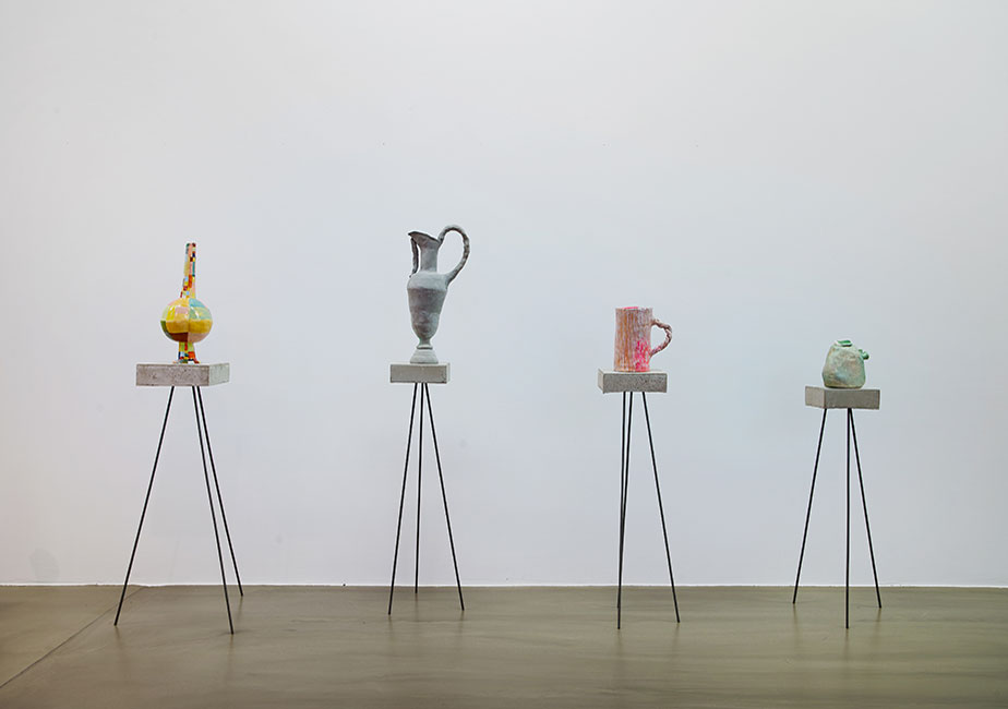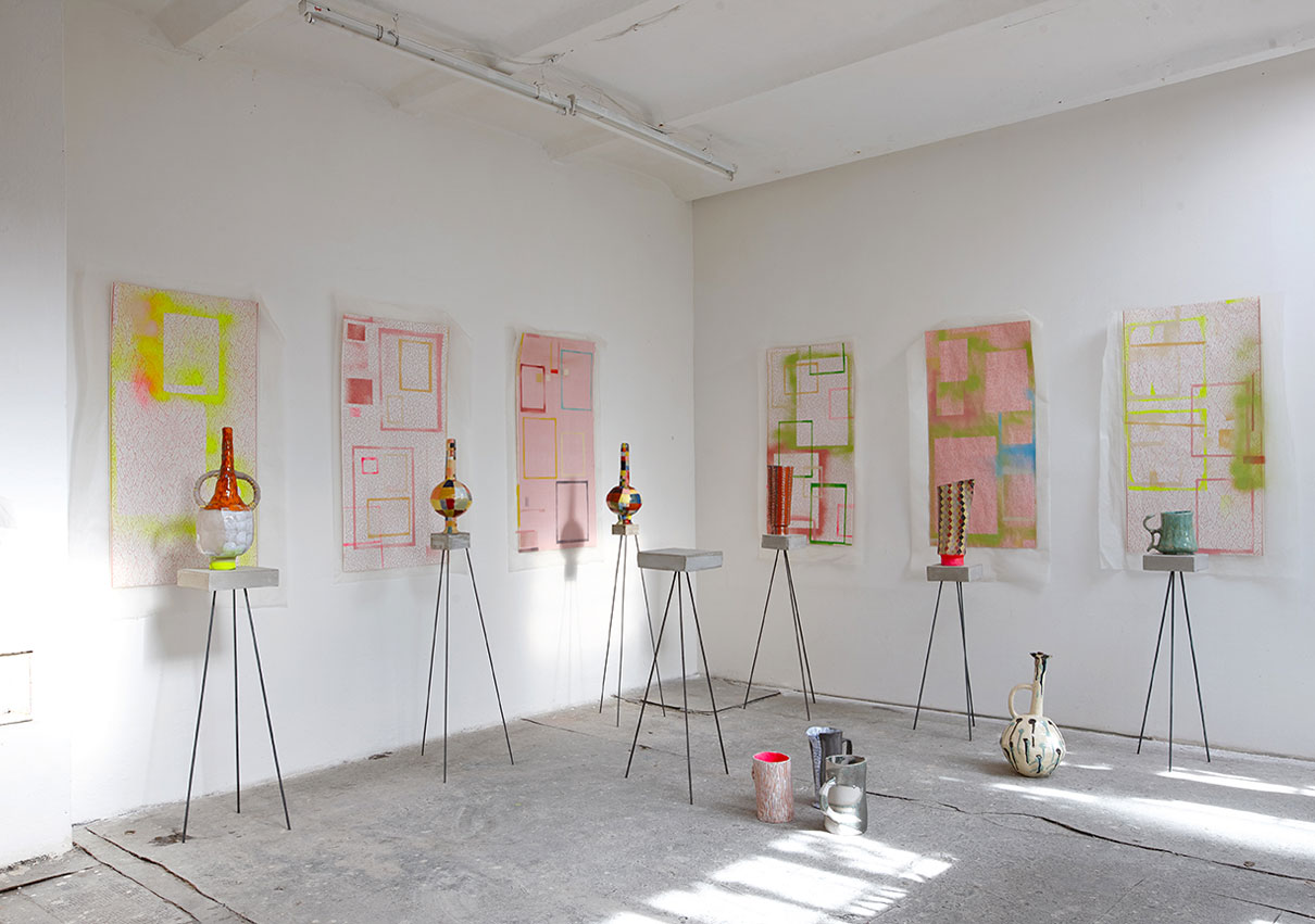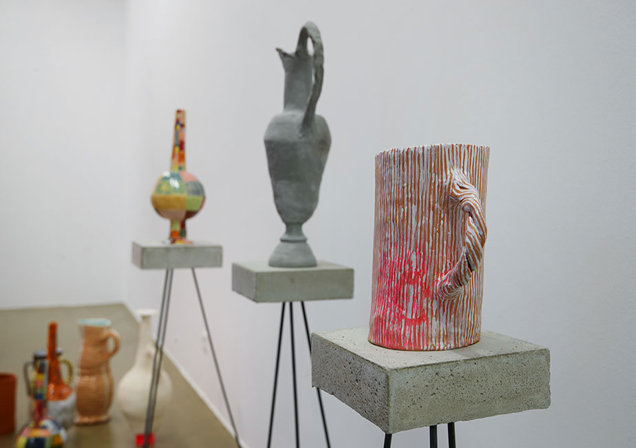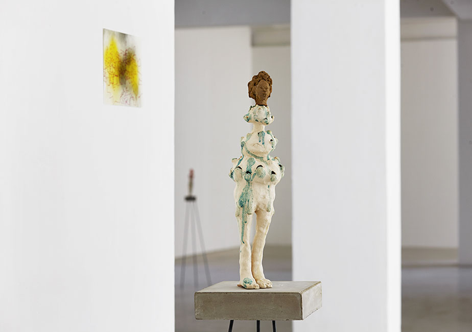 Humans and humanity, life in all its diversity, play a central role in the work of the Düsseldorf artist. Her interest in the complexity that defines us is reflected in the diversity of her work: in her sculptures, installations, audio works, texts, drawings, watercolors and collages, she explores the everyday, the individual and the imperfect, similarities and differences. Her vessel-like and stool-like objects, which evoke associations with moments of togetherness and friendship and which she displays in the back of the exhibition on the floor and on delicate plinths, "remind us of being human", says Carol Pilars de Pilar, and are like mementos for her. The watercolors, photos and collages from the "Passage" installation are also about remembering and sharing, about personal moments and the human body. The anecdotes from her childhood, puberty and youth, which people from different countries shared with her (to be read in the artist's book "Alltag / Everyday Life / Passage"), build a portrait snapshot with the drawn and painted body fragments and tell of the discovery of one's own body, in and changing relationships. In another series of drawings, the artist explores perceptions that go beyond the purely cognitive perception beyond by drawing completely freely and intuitively on the sheet with her eyes closed to classical, pop music, jazz or chanson, for example.