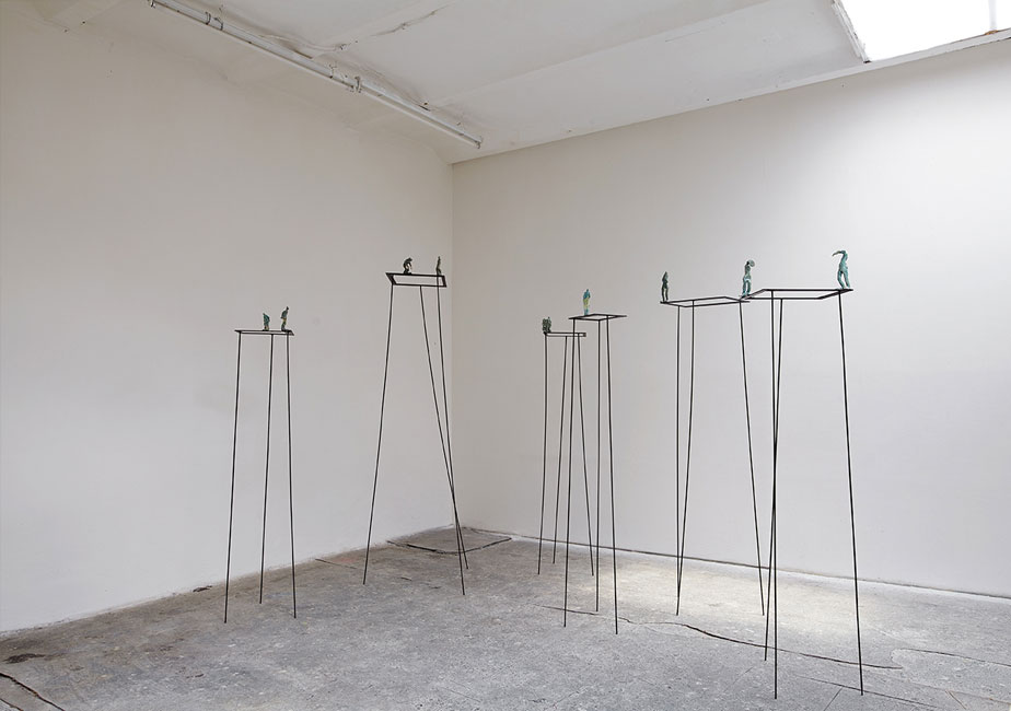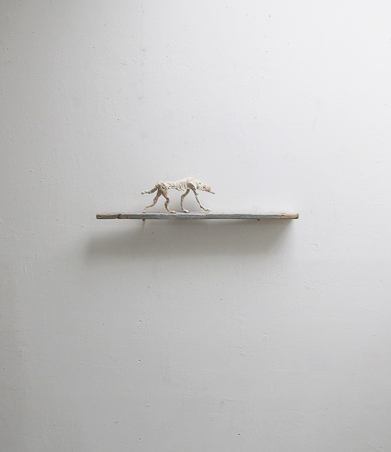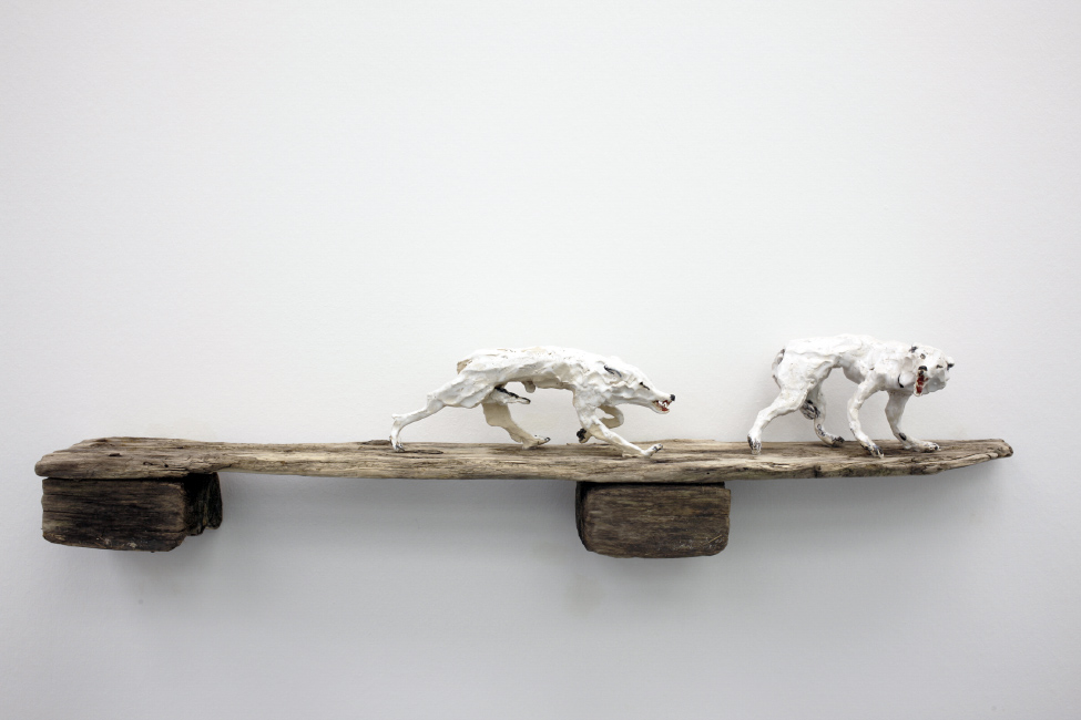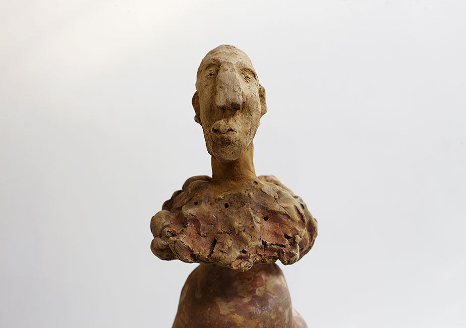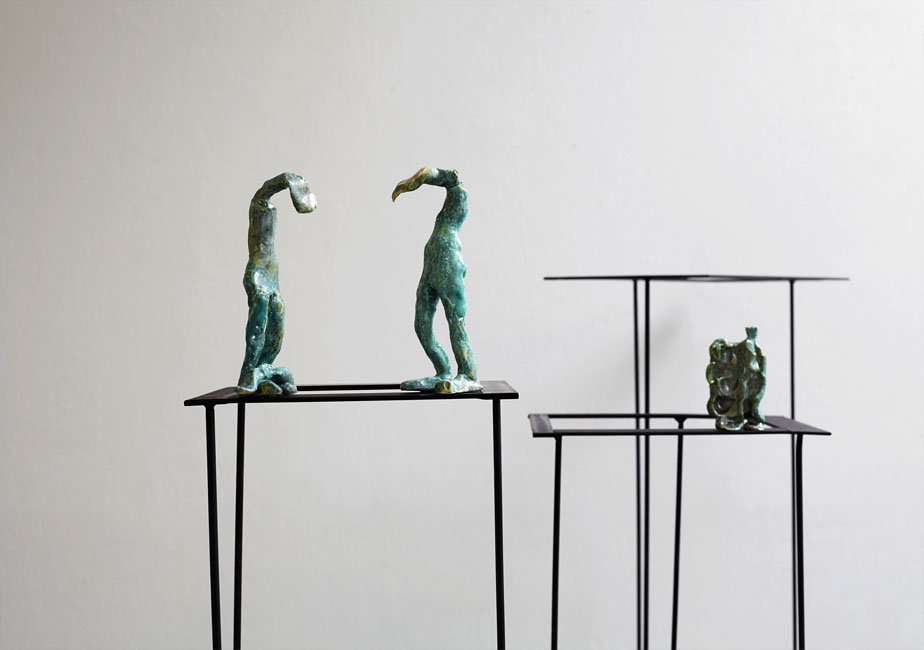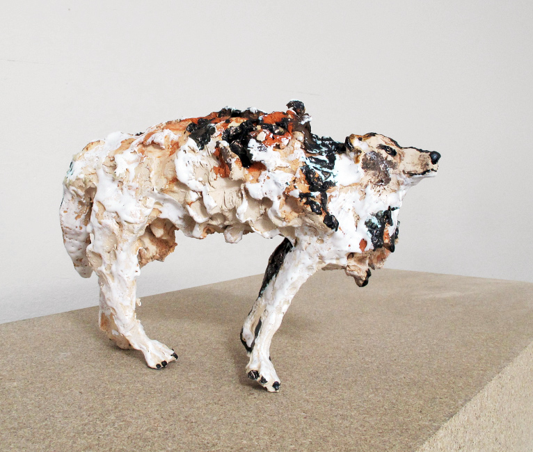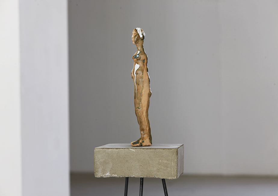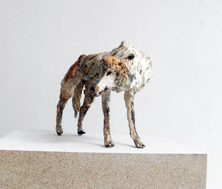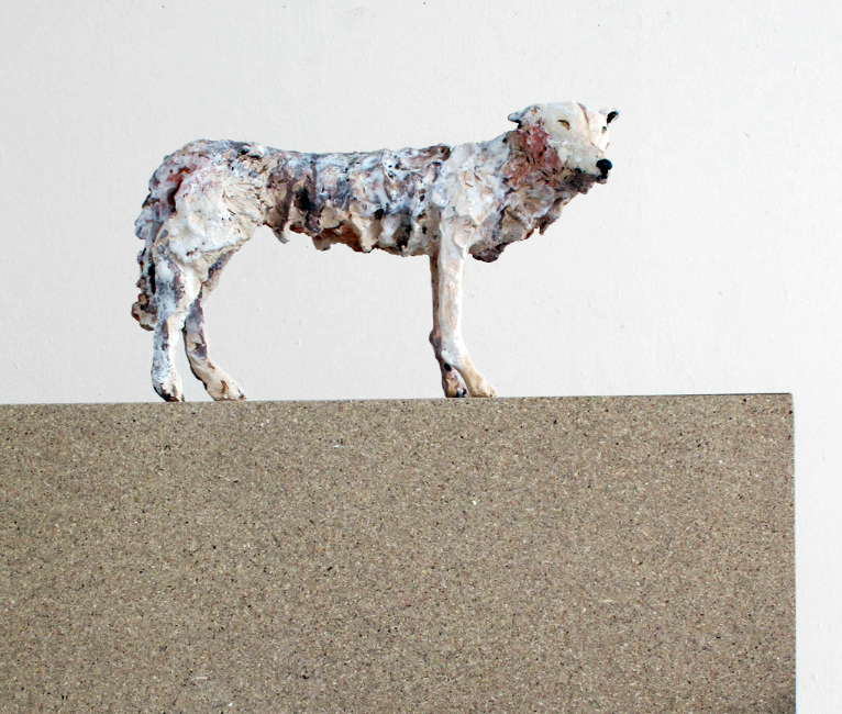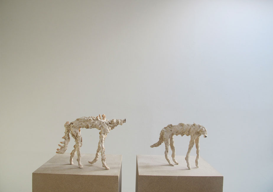 Pilars finds her themes in a profound perception of people and nature. Her view is guided by sympathy and respect but also by curiosity and wonder, which her art reflects inimitably.In her depiction of animals and plants the artist understands to empathize with the creatural, the prototypical of their nature. She succeeds in expressing the vulnerability as well as the wildness—the otherness—of these beings. Her animal sculptures are the result of her ability to observe nature in a highly sensitive manner and grow through the power of the natural materials the artist collects—like driftwood pieces she uses as a base in her assembles of figures. The depicted wolves and dogs therefore appear to be at home in their natural context. The interplay of human-made and found natural materials, of molded burnt clay and driftwood sanded down by natural processes works harmoniously and in the end even determines each other. Analog to how Pilars uses found driftwood covered in patina, she treats selected sound tracks and fragments of language audible next to large-sized but delicate watercolor portraits—merging into an installation. Here are carefully collected and selected pieces of interviews that were recorded during the portrait sessions with her subjects. They tell a fragmented story of the life of their narrator and they too are covered in patina and fragility, tenderness or the briskness of the voice of the individual.Pilars doesn't just want to describe the physical facts of a distinctive human face but she is fascinated by the mental dimension that forms through mutually opening up in the conversations during the portrait sessions and is curious how this influences her work. This process requires a true openness and empathy, qualities that are authentic in Carol Pilars de Pilar and are congenially expressed in her art. In her most recent work, small creatures are balancing carelessly over profound abysses. Here, delicate metal structures are in contrast to the spontaneously molded clay "sketches" of the miniature flâneurs. The art of Pilars de Pilar emanates a great humanistic sympathy for her subjects and their relationship to the world.