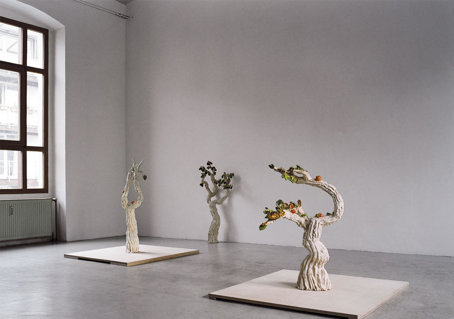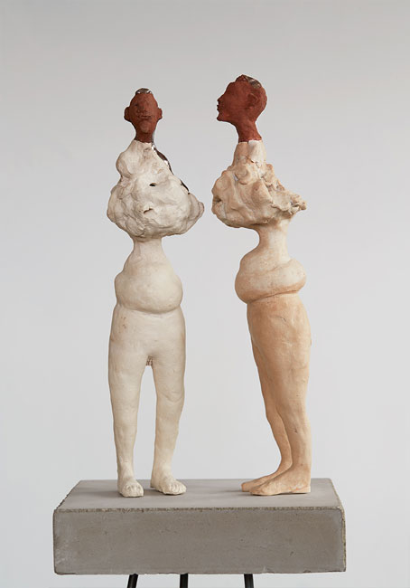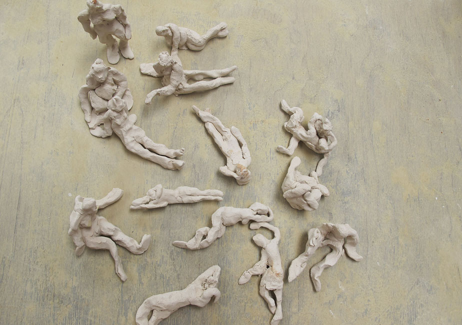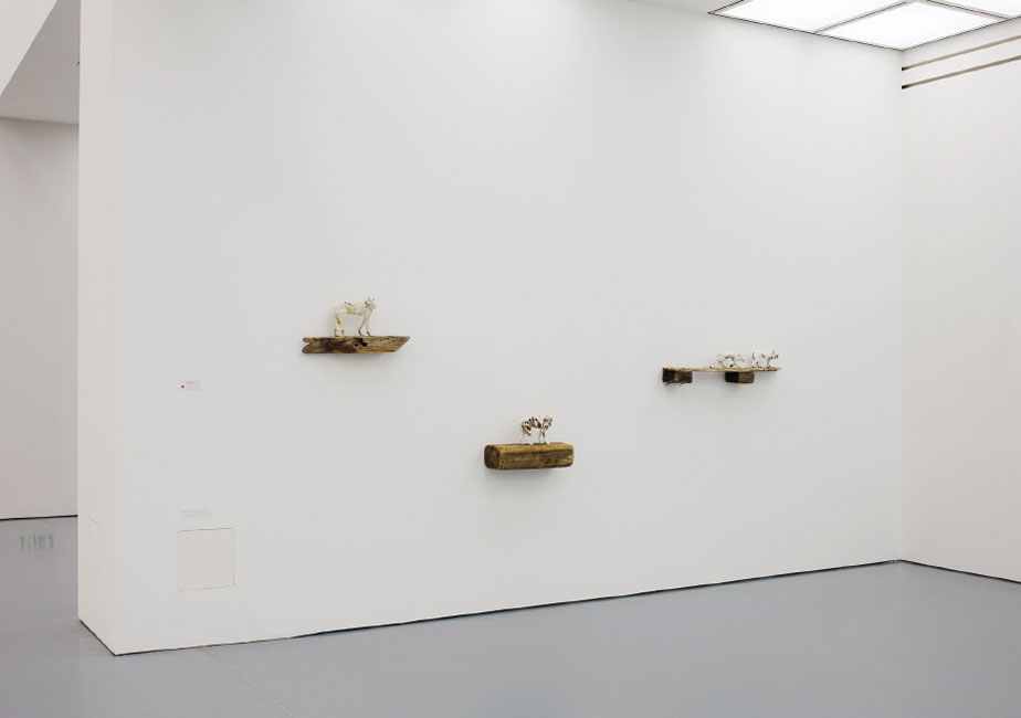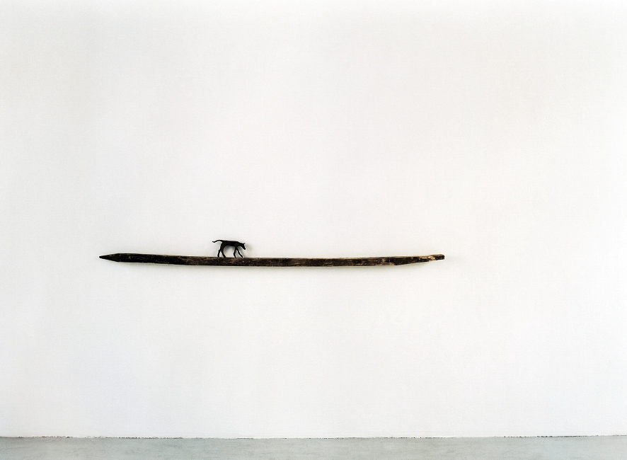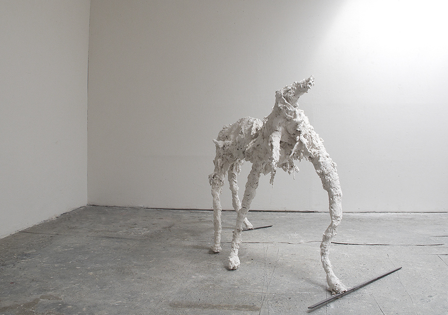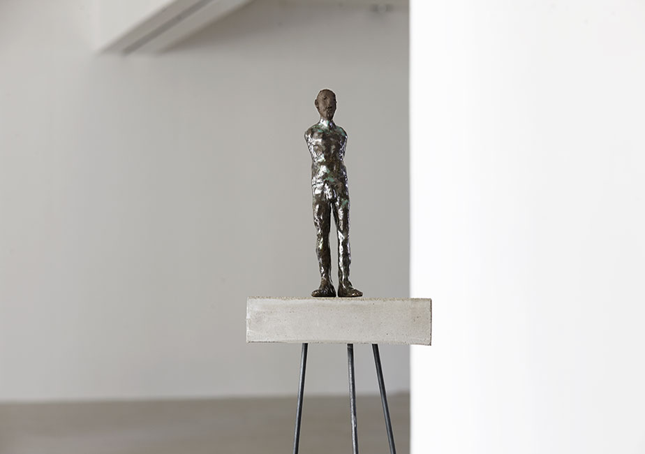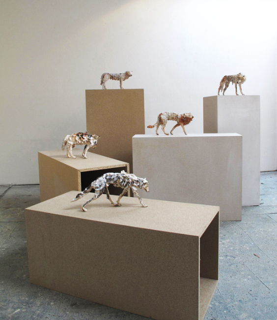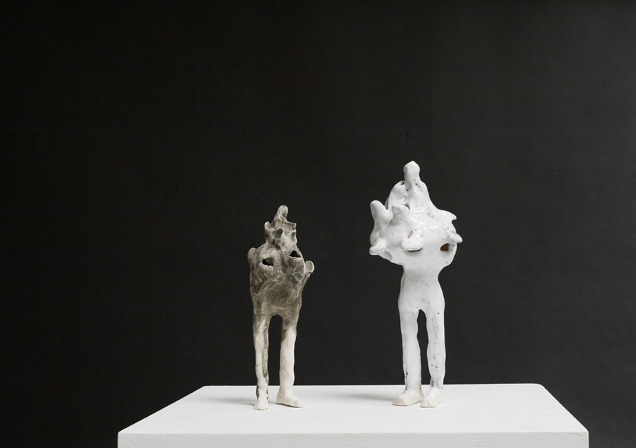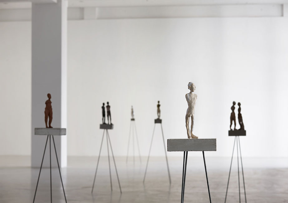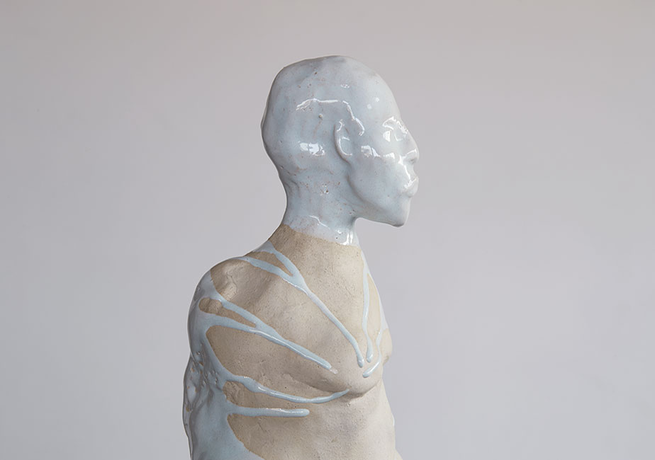 Pilars finds her themes in a profound perception of people and nature. Her view is guided by sympathy and respect but also by curiosity and wonder, which her art reflects inimitably.In her depiction of animals and plants the artist understands to empathize with the creatural, the prototypical of their nature. She succeeds in expressing the vulnerability as well as the wildness—the otherness—of these beings. Her animal sculptures are the result of her ability to observe nature in a highly sensitive manner and grow through the power of the natural materials the artist collects—like driftwood pieces she uses as a base in her assembles of figures. The depicted wolves and dogs therefore appear to be at home in their natural context. The interplay of human-made and found natural materials, of molded burnt clay and driftwood sanded down by natural processes works harmoniously and in the end even determines each other. Analog to how Pilars uses found driftwood covered in patina, she treats selected sound tracks and fragments of language audible next to large-sized but delicate watercolor portraits—merging into an installation. Here are carefully collected and selected pieces of interviews that were recorded during the portrait sessions with her subjects. They tell a fragmented story of the life of their narrator and they too are covered in patina and fragility, tenderness or the briskness of the voice of the individual.Pilars doesn't just want to describe the physical facts of a distinctive human face but she is fascinated by the mental dimension that forms through mutually opening up in the conversations during the portrait sessions and is curious how this influences her work. This process requires a true openness and empathy, qualities that are authentic in Carol Pilars de Pilar and are congenially expressed in her art. In her most recent work, small creatures are balancing carelessly over profound abysses. Here, delicate metal structures are in contrast to the spontaneously molded clay "sketches" of the miniature flâneurs. The art of Pilars de Pilar emanates a great humanistic sympathy for her subjects and their relationship to the world.