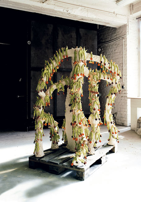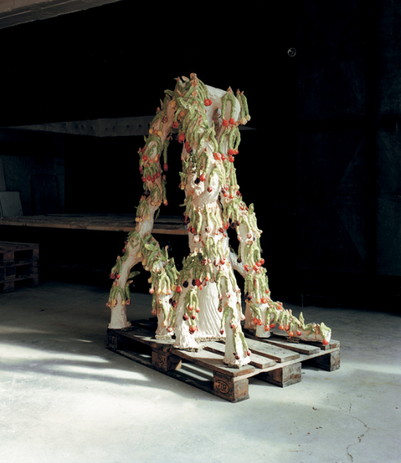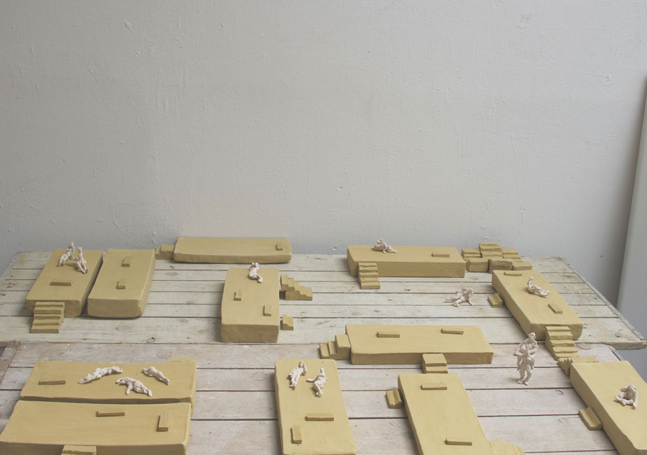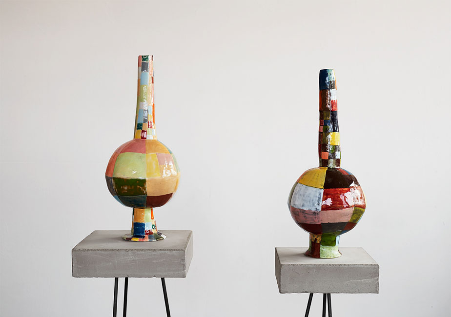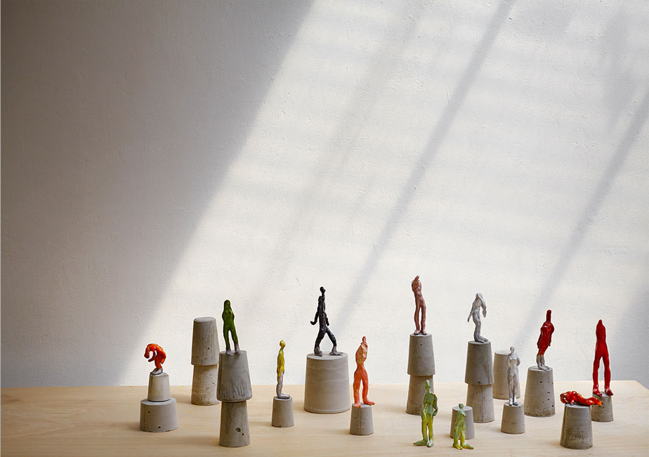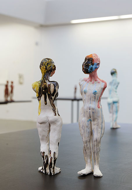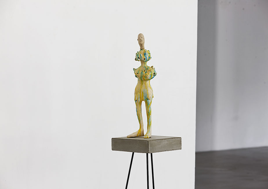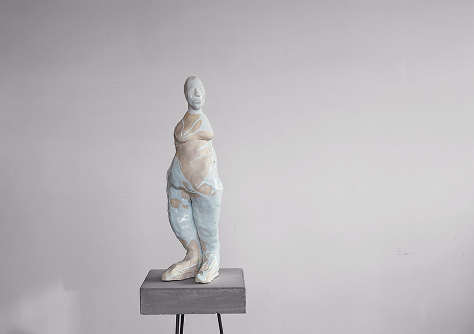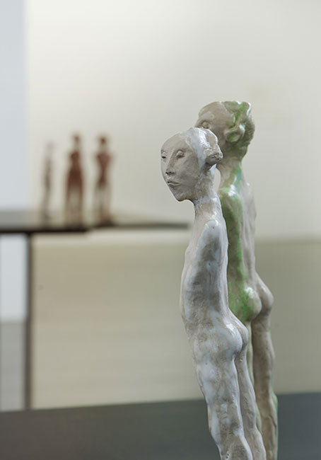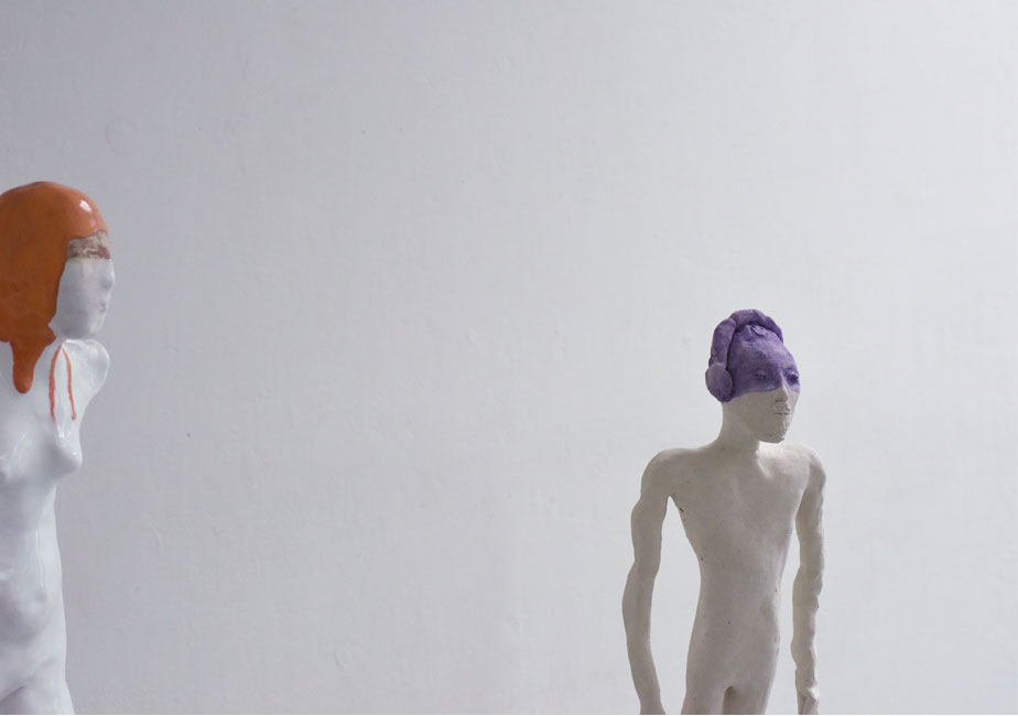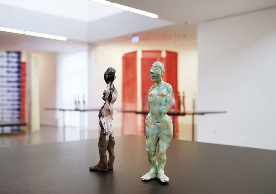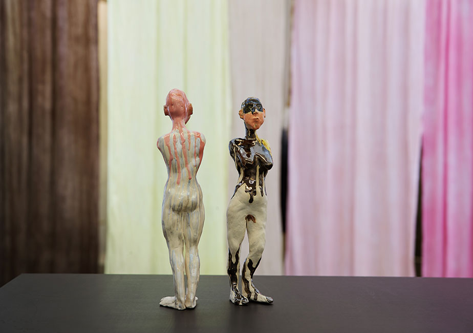 "Along the Voices", visitors move through the installation of the same name, through corridors and separees formed by colorful, built textile - an spatial structure in which simple furniture constructions made of bulky waste and plywood invite visitors to sit or lie down and, above all, to listen. Outside these protective yet permeable areas, the artist presents ceramic figures, not individually on pedestals, but in direct relation to each other, facing each other, standing next to each other or even isolated. The black wooden planks on which they stand are reminiscent of a stage - and yet the installation remains un-theatrical. Sometimes readable as male, sometimes as female or both, in different colors, upright and yet fragile in their materiality, the figures reflect the diversity of human bodies and identities and at the same time show the commonality, the sameness across gender norms and skin colors.