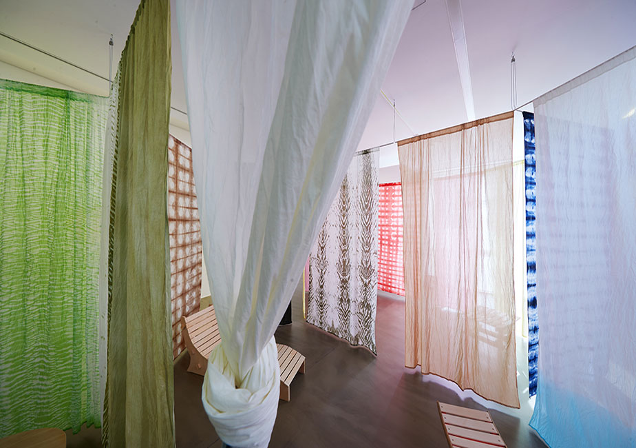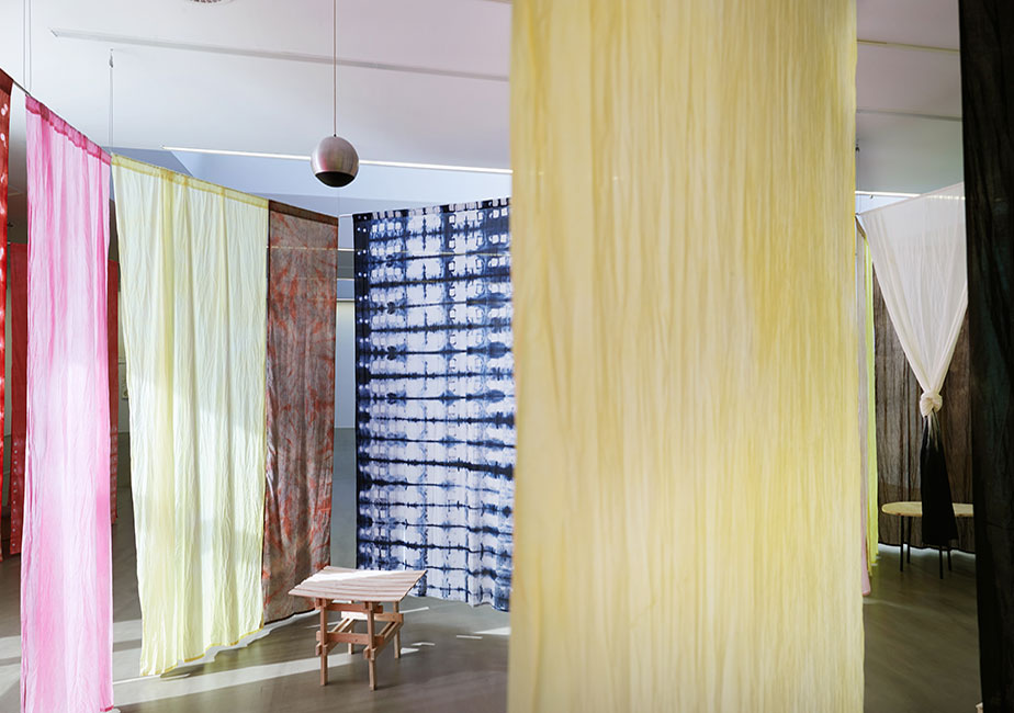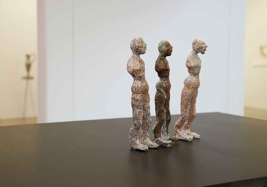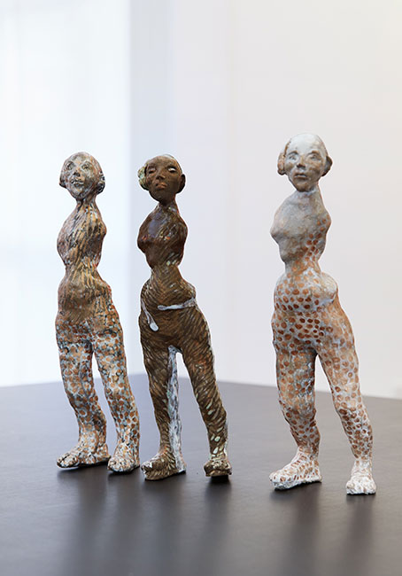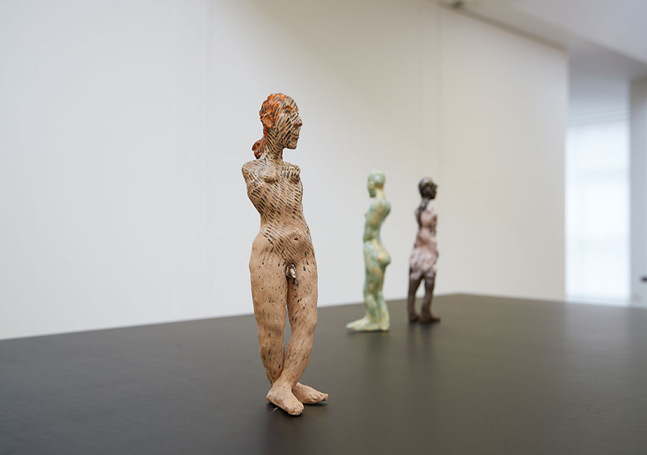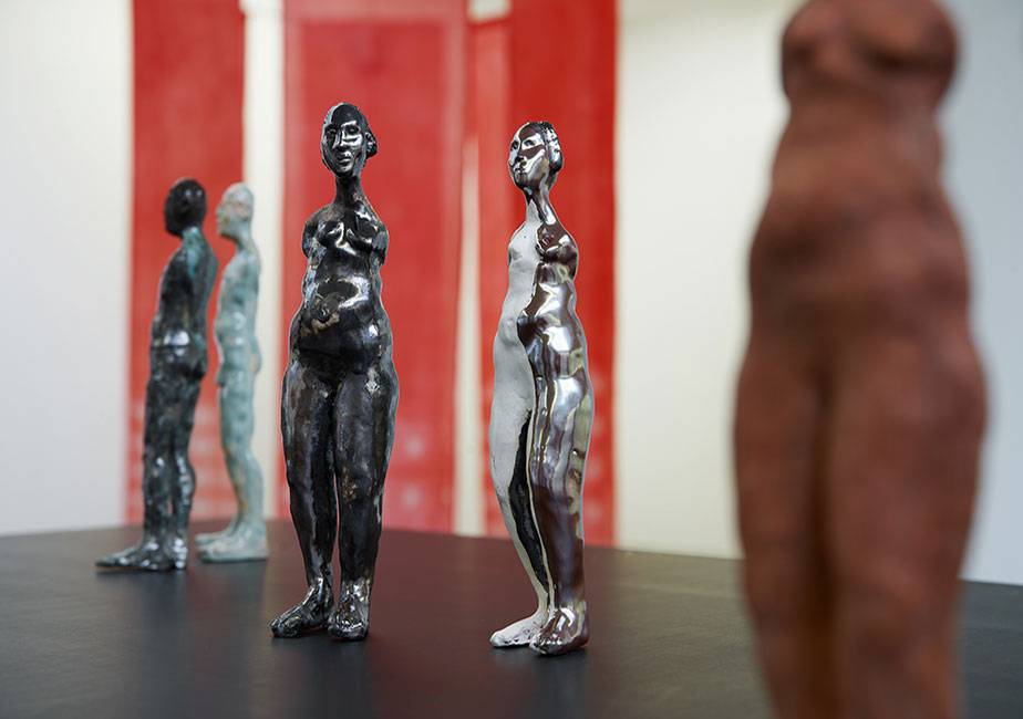 „Along the Voices“ (Entlang der Stimmen) bewegen sich dann auch die Besucher*innen durch die gleichnamige Installation, durch Gänge und Separees, die von farbigen, gebatikten Stoffbahnen gebildet werden – ein intimes Raumgefüge, in denen einfache Möbelkonstruktionen aus Rest- und Sperrholz zum Verweilen im Sitzen oder Liegen und vor allem zum Zuhören einladen. Außerhalb dieser schützenden und doch durchlässigen Bereiche präsentiert die Künstlerin Keramikfiguren, nicht einzeln auf Sockeln, sondern in direktem Bezug zueinander, einander zugewendet, neben einander stehend oder auch vereinzelt. Die schwarzen Holzplatten, auf denen sie stehen, erinnern an eine Bühne – und doch bleibt die Installation untheatralisch. Mal männlich, mal weiblich lesbar oder auch beides, verschiedenfarbig, aufrechtstehend und doch fragil in ihrer Materialität, geben die Figuren die Vielfalt der menschlichen Körper und Identitäten wieder und zeigen gleichzeitig das Gemeinsame, Gleiche über Geschlechternormen und Hautfarben hinweg auf.